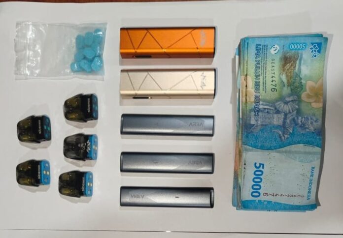 Dari tangan DLH, polisi menyita 10 butir pil ekstasi berlogo Rolex, 5 cartridge liquid vape merek Sidepiece Vape berisi zat MDMB-4en-PINACA, 3 unit vape merek Veev, 2 unit vape Sidepiece, uang tunai Rp4,5 juta, dan 1 ponsel yang digunakan untuk transaksi.