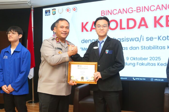 TelegrapNews.com, Batam – Polda Kepri menggelar kegiatan Bincang-Bincang Kapolda Kepri Bersama Mahasiswa se-Kota Batam Tahun 2025 yang berlangsung di Gedung Fakultas Kedokteran Universitas Internasional Batam (UIB). Kegiatan ini bertujuan mempererat komunikasi antara Polri dan kalangan akademisi serta mahasiswa dalam menjaga stabilitas keamanan dan ketertiban masyarakat (Kamtibmas) di Provinsi Kepulauan Riau. Kamis (9/10/2025).